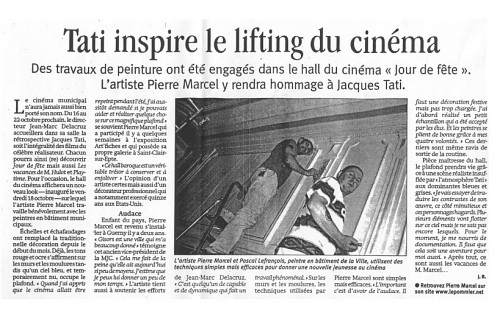 (...)le hall du cinéma affichera un nouveau look (...) Inauguré le vendredi 18 octobre(..) sur lequel l'artiste Pierre Marcel travaille bénévolement..."Quand j'ai appris que le cinéma allait être repeint, j'ai aussitôt demandé si je pouvais aider et réaliser quelque chose sur ce magnifique plafond"(...)"ce hall baroque est un véritable trésor à conserver et à enjoliver" L"opinion d'un artiste certes mais aussi d'un décorateur professionnel qui a notamment exercé quinze ans aux Etats-Unis.